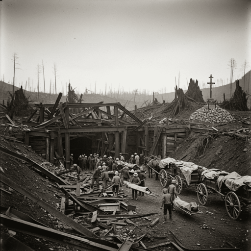 坑内のメタンガス濃度上昇に加え、保安管理体制の不備が重なり、爆風と落盤被害が坑内全域に拡大。坑口付近でも爆風が吹き荒れ、地上作業員数名も命を落としたと記録されています。