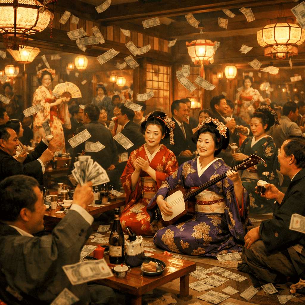 坑夫たちは一週間分の黒い給料を握りしめ、二字町の坂をトントンと登ります。門をくぐれば、華やかな灯りが迎え、料亭では芸妓さんが三味線を爪弾き、宴は朝まで。「札束乱舞して花街夜飲声に濁る」と、当時の記録に残るほどの熱狂でした。