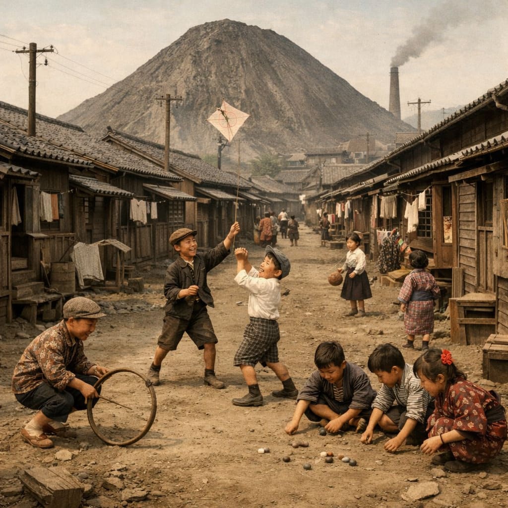- 路地で遊ぶ子どもたちと、ボタ山のシルエット