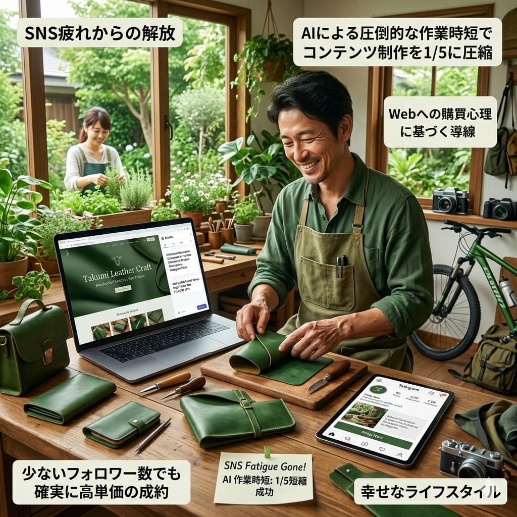 「SNS疲れ」から解放されます。AIによる圧倒的な作業時短でコンテンツ制作を1/5に圧縮。さらに、SNSからWebへの購買心理に基づく導線を敷くことで、少ないフォロワー数でも確実に高単価の成約を生み出します。 - 🚀 新規事業の起業家の方へ